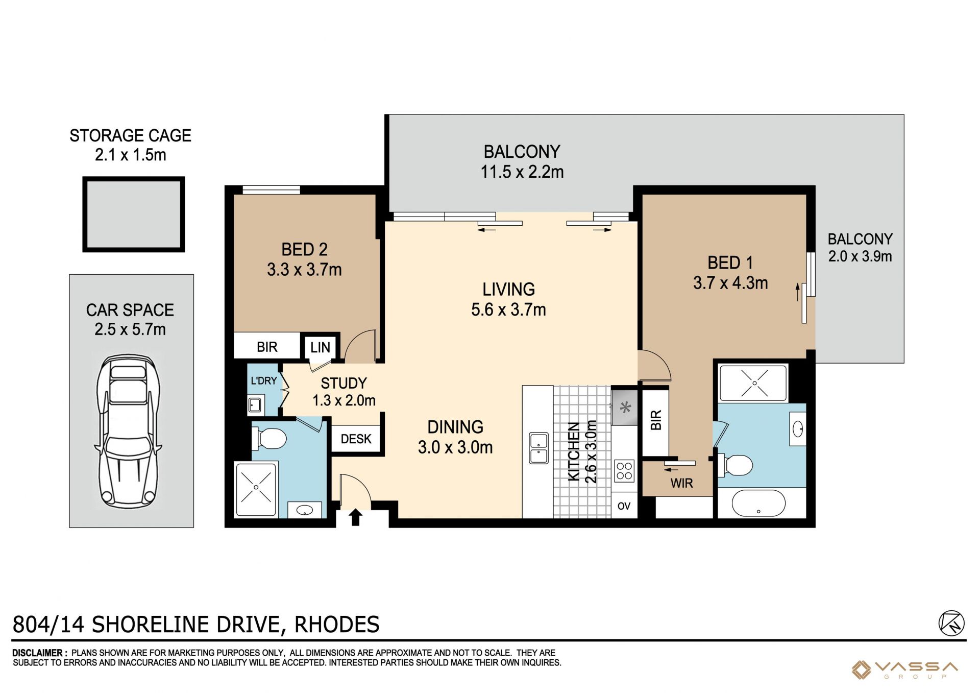 - Master bedroom with walk-in robe and built-in robe, separate study area in living room