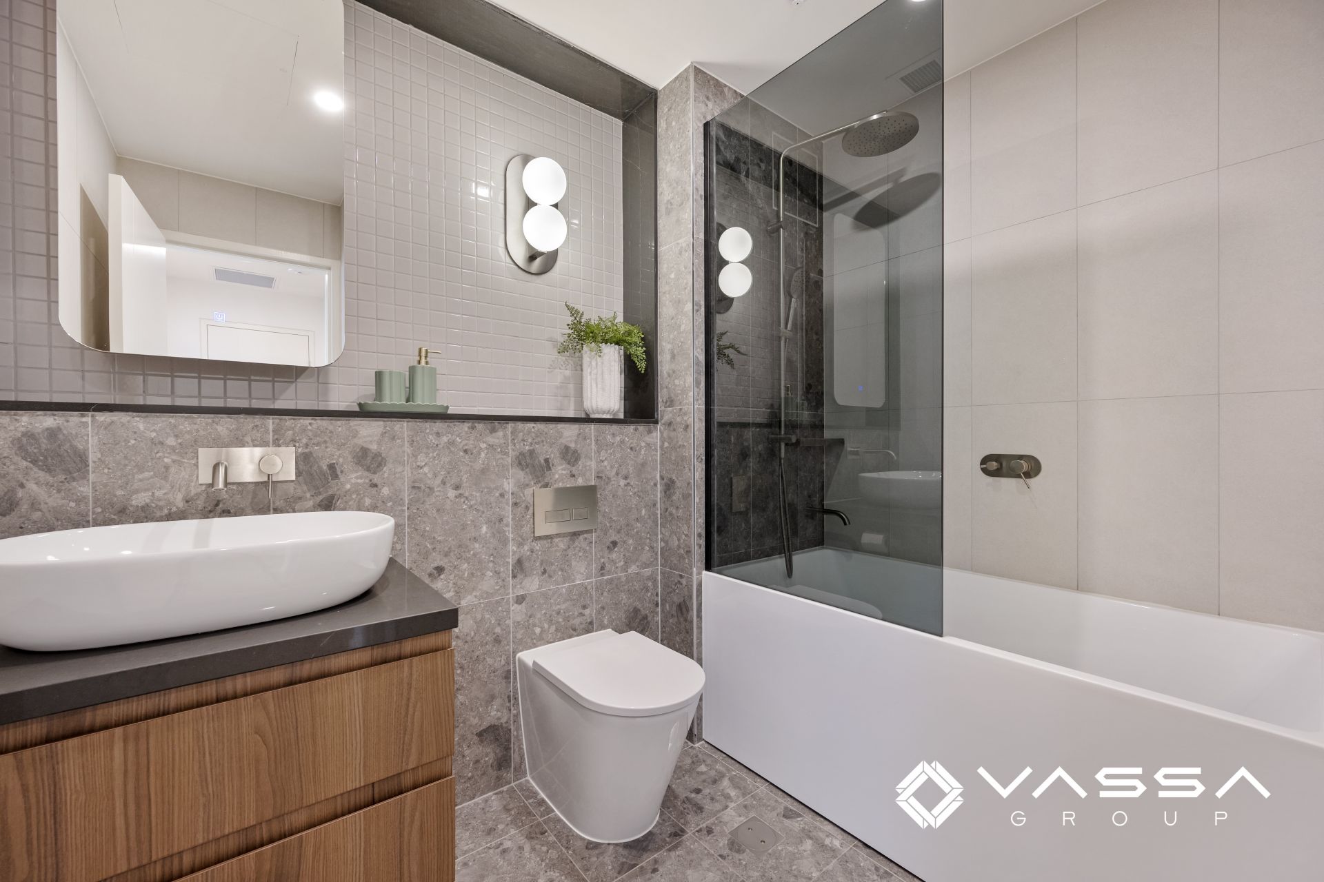 -Luxuriously styled bathrooms with floor-to-ceiling tiles; includes an internal laundry equipped with a dryer.