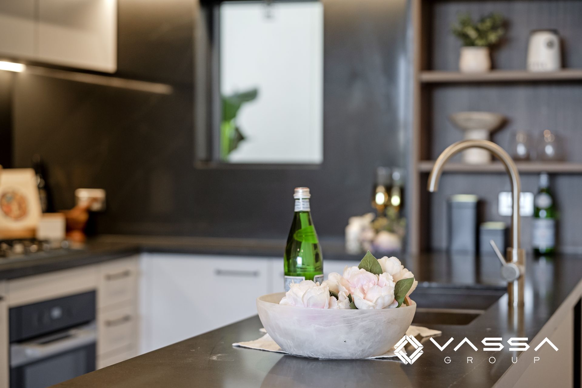 -A designer kitchen with marble benchtops and splashbacks, Miele appliances, and gas cooking.